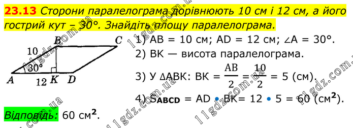 Сторони паралелограма дорівнюють 10 см і 12 см, а його гострий кут – 30°. Знайдіть площу паралелограма. 1) AB = 10 cм; AD = 12 см; ∠A = 30°. 2) BK — висота паралелограма. 3) У ∆АВК: ВК = АВ/2 = 10/2 = 5 (см). 4) SABCD = AD • BK= 12 • 5 = 60 (см2). Відповідь: 60 см2.