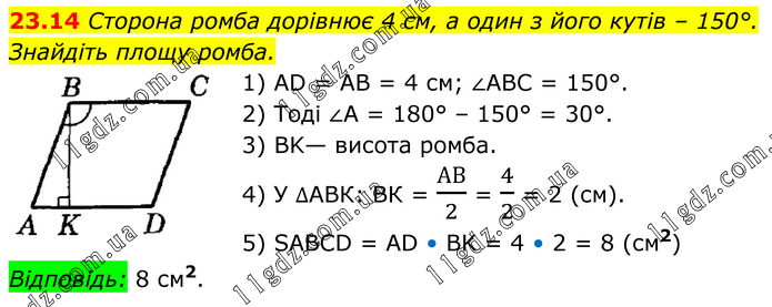 Сторона ромба дорівнює 4 см, а один з його кутів – 150°. Знайдіть площу ромба. 1) AD = AB = 4 см; ∠ABC = 150°. 2) Тоді ∠A = 180° – 150° = 30°. 3) BK— висота ромба. 4) У ∆АВК: ВК = АВ/2 = 4/2 = 2 (см). 5) SABCD = AD • BK = 4 • 2 = 8 (см2) Відповідь: 8 см2.