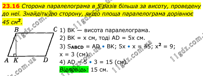 Сторона паралелограма в 5 разів більша за висоту, проведену до неї. Знайдіть цю сторону, якщо площа паралелограма дорівнює 45 см2. 1) BK — висота паралелограма. 2) BK = х см, тоді AD = 5х см. 3) SABCD = AD • BK; 5х • x = 45; х2 = 9; х = 3 (см). 4) AD = 5 • 3 = 15 (см). Відповідь: 15 см.