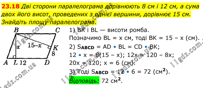 Дві сторони паралелограма дорівнюють 8 см і 12 см, а сума двох його висот, проведених з однієї вершини, дорівнює 15 см. Знайдіть площу паралелограма. 1) BK і BL — висоти ромба. Позначимо BL = х см, тоді BK = 15 – х (см). 2) SABCD = AD • BL = CD • BK; 12 • х = 8(15 – х); 12x = 120 – 8х; 20х = 120; х = 6 (см). 3) Тоді SABCD = 12 • 6 = 72 (см2). Відповідь: 72 см2.