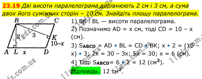 Дві висоти паралелограма дорівнюють 2 см і 3 см, а сума двох його суміжних сторін – 10 см. Знайдіть площу паралелограма. 1) BK і BL — висоти паралелограма. 2) Позначимо AD = х см, тоді CD = 10 – х (см). 3) SABCD = AD • BL = CD • BK; х • 2 = (10 – х) • 3; 2х = 30 – Зх; 5х = 30; х = 6 (см). 4) Тоді SABCD= 6 • 2 = 12 (см2). Відповідь: 12 см2.