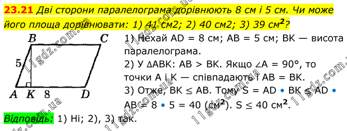 Дві сторони паралелограма дорівнюють 8 см і 5 см. Чи може його площа дорівнювати: 1) 41 см2; 2) 40 см2; 3) 39 см2? 1) Нехай AD = 8 см; AB = 5 см; BK — висота паралелограма. 2) У ∆ABK: AB > BK. Якщо ∠A = 90°, то точки А і K — співпадають і AB = BK. 3) Отже, BK ≤ AB. Тому S = AD • ВК ≤ AD • AB = 8 • 5 = 40 (см2). S ≤ 40 см2. Відповідь: 1) Ні; 2), 3) так.