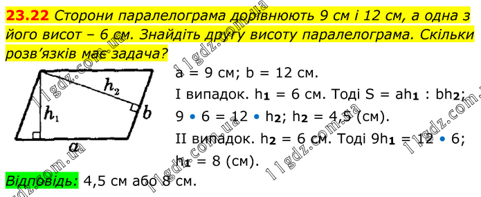 Сторони паралелограма дорівнюють 9 см і 12 см, а одна з його висот – 6 см. Знайдіть другу висоту паралелограма. Скільки розв’язків має задача? а = 9 см; b = 12 см. I випадок. h1 = 6 см. Тоді S = ah1 : bh2; 9 • 6 = 12 • h2; h2 = 4,5 (см). ІІ випадок. h2 = 6 см. Тоді 9h1 = 12 • 6; h1 = 8 (см). Відповідь: 4,5 см або 8 см.