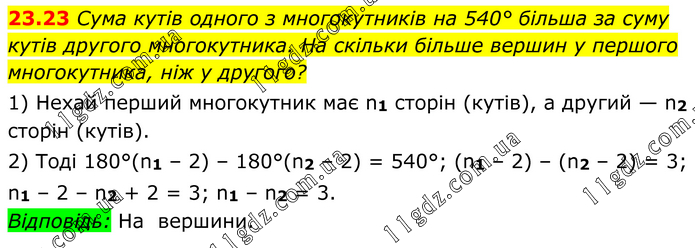 Сума кутів одного з многокутників на 540° більша за суму кутів другого многокутника. На скільки більше вершин у першого многокутника, ніж у другого? 1) Нехай перший многокутник має n1 сторін (кутів), а другий — n2 сторін (кутів). 2) Тоді 180°(n1 – 2) – 180°(n2 – 2) = 540°; (n1 – 2) – (n2 – 2) = 3; n1 – 2 – n2 + 2 = 3; n1 – n2 = 3. Відповідь: На вершини.