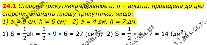 Сторона трикутника дорівнює a, h – виcота, проведена до цієї сторони. Знайдіть площу трикутника, якщо: 1) a = 9 см, h = 6 см; 2) a = 4 дм, h = 7 дм. 1) S = 1/2ah = 1/2 • 9 • 6 = 27 (см2); 2) S = 1/2 • 4 • 7 = 14 (дм2).