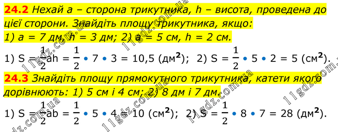 24.2 Нехай a – сторона трикутника, h – висота, проведена до цієї сторони. Знайдіть площу трикутника, якщо: 1) a = 7 дм, h = 3 дм; 2) a = 5 см, h = 2 см. 1) S = 1/2ah = 1/2 • 7 • 3 = 10,5 (дм2); 2) S = 1/2 • 5 • 2 = 5 (см2). 24.3 Знайдіть площу прямокутного трикутника, катети якого дорівнюють: 1) 5 см і 4 см; 2) 8 дм і 7 дм. 1) S = 1/2ab = 1/2 • 5 • 4 = 10 (см2); 2) S = 1/2 • 8 • 7 = 28 (дм2).