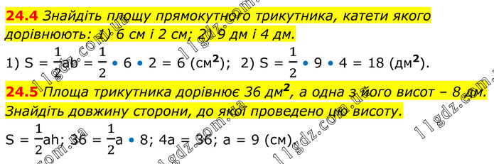 24.4 Знайдіть площу прямокутного трикутника, катети якого дорівнюють: 1) 6 см і 2 см; 2) 9 дм і 4 дм. 1) S = 1/2ab = 1/2 • 6 • 2 = 6 (см2); 2) S = 1/2 • 9 • 4 = 18 (дм2). 24.5 Площа трикутника дорівнює 36 дм2, а одна з його висот – 8 дм. Знайдіть довжину сторони, до якої проведено цю висоту. S = 1/2ah; 36 = 1/2a • 8; 4a = 36; a = 9 (см).