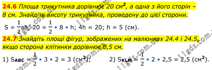 24.6 Площа трикутника дорівнює 20 см2, а одна з його сторін – 8 см. Знайдіть висоту трикутника, проведену до цієї сторони. S = 1/2ah; 20 = 1/2 • 8 • h; 4h = 20; h = 5 (см). 24.7 Знайдіть площі фігур, зображених на малюнках 24.4 і 24.5, якщо сторона клітинки дорівнює 0,5 см. 1) SABC = 1/2 • 3 • 2 = 3 (см2); 2) SKLM = 1/2 • 2 • 2,5 = 2,5 (см2).