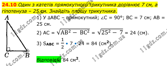 Один з катетів прямокутного трикутника дорівнює 7 см, а гіпотенуза – 25 см. Знайдіть площу трикутника. 1) У ∆АВС – прямокутний; ∠С = 90°; BC = 7 см; АВ = 25 см. 2) AС = √(AB^2- 〖BС〗^2 ) = √(25^2- 7) = 24 (см). 3) SABC = 1/2 • 7 • 24 = 84 (см2). Відповідь: 84 см2.