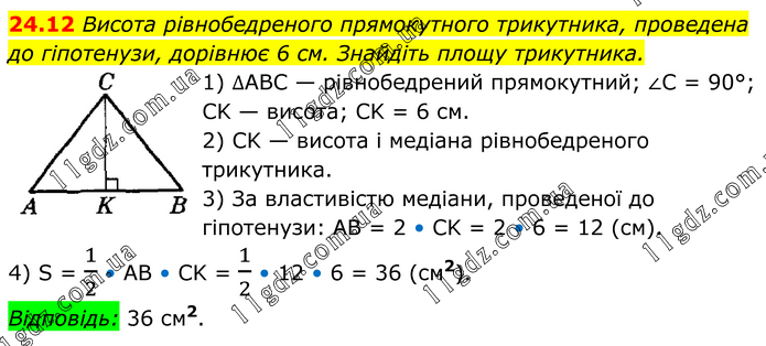 Висота рівнобедреного прямокутного трикутника, проведена до гіпотенузи, дорівнює 6 см. Знайдіть площу трикутника. 1) ∆ABC — рівнобедрений прямокутний; ∠C = 90°; CK — висота; CK = 6 см. 2) CK — висота і медіана рівнобедреного трикутника. 3) За властивістю медіани, проведеної до гіпотенузи: AB = 2 • CK = 2 • 6 = 12 (см). 4) S = 1/2 • AB • CK = 1/2 • 12 • 6 = 36 (см2). Відповідь: 36 см2.