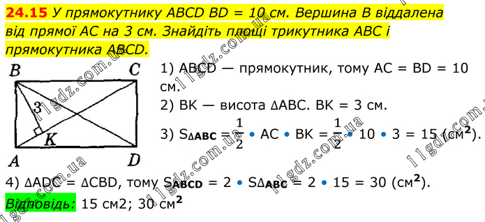 У прямокутнику ABCD BD = 10 см. Вершина B віддалена від прямої AC на 3 см. Знайдіть площі трикутника ABC і прямокутника ABCD. 1) ABCD — прямокутник, тому AC = BD = 10 см. 2) BK — висота ∆ABC. BK = 3 см. 3) S∆ABC = 1/2 • AC • BK = 1/2 • 10 • 3 = 15 (см2). 4) ∆ADC = ∆CBD, тому SABCD = 2 • S∆ABC = 2 • 15 = 30 (см2). Відповідь: 15 см2; 30 см2.