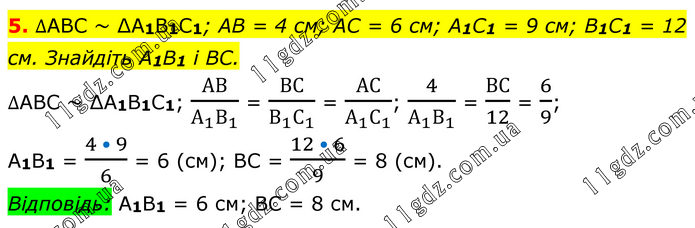 ∆АВС ~ ∆А1В1С1; AB = 4 см; AC = 6 см; A1C1 = 9 см; B1C1 = 12 см. Знайдіть A1B1 і BC. ∆АВС ~ ∆А1В1С1; АВ/(А_1 В_1 ) = ВС/(В_1 С_1 ) = АС/(А_1 С_1 ); 4/(А_1 В_1 ) = ВС/12 = 6/9; А1В1 = (4 • 9)/6 = 6 (см); ВС = (12 • 6)/9 = 8 (см). Відповідь: А1В1 = 6 см; ВС = 8 см.