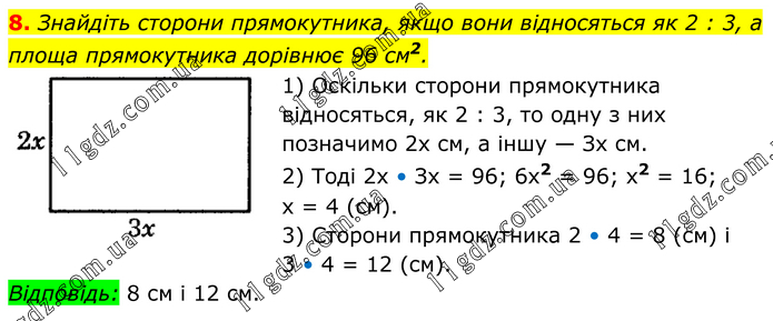 Знайдіть сторони прямокутника, якщо вони відносяться як 2 : 3, а площа прямокутника дорівнює 96 см2. 1) Оскільки сторони прямокутника відносяться, як 2 : 3, то одну з них позначимо 2х см, а іншу — Зх см. 2) Тоді 2х • Зх = 96; 6х2 = 96; х2 = 16; х = 4 (см). 3) Сторони прямокутника 2 • 4 = 8 (см) і 3 • 4 = 12 (см). Відповідь: 8 см і 12 см.