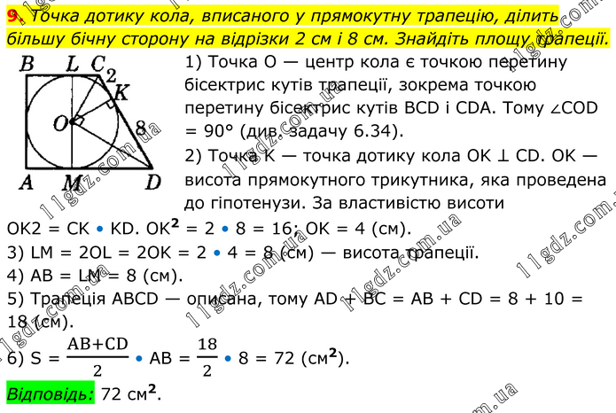 Точка дотику кола, вписаного у прямокутну трапецію, ділить більшу бічну сторону на відрізки 2 см і 8 см. Знайдіть площу трапеції. 1) Точка O — центр кола є точкою перетину бісектрис кутів трапеції, зокрема точкою перетину бісектрис кутів BCD і CDA. Тому ∠COD = 90° (див. задачу 6.34). 2) Точка K — точка дотику кола OK ⊥ CD. OK — висота прямокутного трикутника, яка проведена до гіпотенузи. За властивістю висоти OK2 = CK • KD. OK2 = 2 • 8 = 16; OK = 4 (см). 3) LM = 2OL = 2OK = 2 • 4 = 8 (см) — висота трапеції. 4) AB = LM = 8 (см). 5) Трапеція ABCD — описана, тому AD + BC = AB + CD = 8 + 10 = 18 (см). 6) S = (AB+CD)/2 • AB = 18/2 • 8 = 72 (см2). Відповідь: 72 см2.