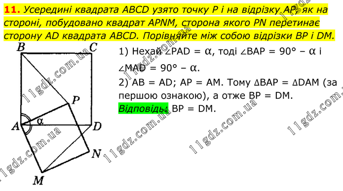 Усередині квадрата ABCD узято точку P і на відрізку AP, як на стороні, побудовано квадрат APNM, сторона якого PN перетинає сторону AD квадрата ABCD. Порівняйте між собою відрізки BP і DM. 1) Нехай ∠PAD = α, тоді ∠BAP = 90° – α і ∠MAD = 90° – α. 2) AB = AD; AP = AM. Тому ∆ВАР = ∆DAM (за першою ознакою), а отже BP = DM. Відповідь: BP = DM.