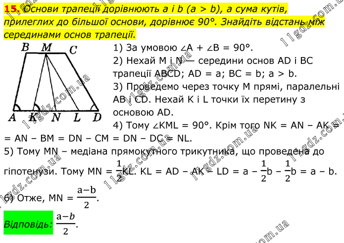 Основи трапеції дорівнюють а і b (a > b), а сума кутів, прилеглих до більшої основи, дорівнює 90°. Знайдіть відстань між серединами основ трапеції. 1) За умовою ∠A + ∠B = 90°. 2) Нехай M i N — середини основ AD і BC трапеції ABCD; AD = a; BC = b; а > b. 3) Проведемо через точку M прямі, паралельні AB і CD. Нехай K i L точки їх перетину з основою AD. 4) Тому ∠KML = 90°. Крім того NK = AN – AK = = AN – BM = DN – CM = DN – DC = NL. 5) Тому MN – медіана прямокутного трикутника, що проведена до гіпотенузи. Тому MN = 1/2KL. KL = AD – AK – LD = a – 1/2b – 1/2b = a – b. 6) Отже, MN = (a-b)/2. Відповідь: (a-b)/2.