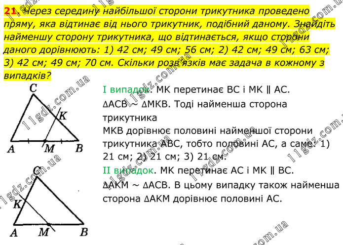 Через середину найбільшої сторони трикутника проведено пряму, яка відтинає від нього трикутник, подібний даному. Знайдіть найменшу сторону трикутника, що відтинається, якщо сторони даного дорівнюють: 1) 42 см; 49 см; 56 см; 2) 42 см; 49 см; 63 см; 3) 42 см; 49 см; 70 см. Скільки розв’язків має задача в кожному з випадків? I випадок. MK перетинає BC і MK ∥ AC. ∆ACB ~ ∆МКВ. Тоді найменша сторона трикутника MKB дорівнює половині найменшої сторони трикутника ABC, тобто половині AC, а саме: 1) 21 см; 2) 21 см; 3) 21 см. II випадок. MK перетинає AC і MK ∥ BC. ∆AKM ~ ∆АСВ. В цьому випадку також найменша сторона ∆AKM дорівнює половині AC.