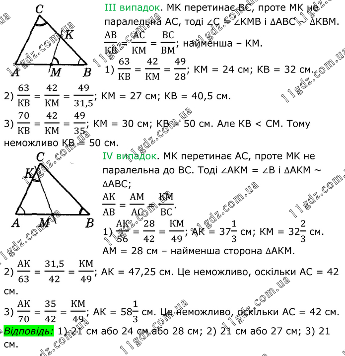 III випадок. MK перетинає ВС, проте MK не паралельна AC, тоді ∠C = ∠KMB і ∆АВС ~ ∆КВМ. АВ/КВ = АС/КМ = ВС/ВМ; найменша – КМ. 1) 63/КВ = 42/КМ = 49/28; КМ = 24 см; КВ = 32 см. 2) 63/КВ = 42/КМ = 49/31,5; КМ = 27 см; КВ = 40,5 см. 3) 70/КВ = 42/КМ = 49/35; КМ = 30 см; КВ = 50 см. Але КВ < СМ. Тому неможливо КВ = 50 см. IV випадок. MK перетинає AC, проте MK не паралельна до ВС. Тоді ∠AKM = ∠B і ∆AKM ~ ∆АВС; АК/АВ = АМ/АС = КМ/ВС. 1) АК/56 = 28/42 = КМ/49; АК = 371/3 см; КМ = 322/3 см. АМ = 28 см – найменша сторона ∆АКМ. 2) АК/63 = 31,5/42 = КМ/49; АК = 47,25 см. Це неможливо, оскільки АС = 42 см. 3) АК/70 = 35/42 = КМ/49; АК = 581/3 см. Це неможливо, оскільки АС = 42 см. Відповідь: 1) 21 см або 24 см або 28 см; 2) 21 см або 27 см; 3) 21 см.