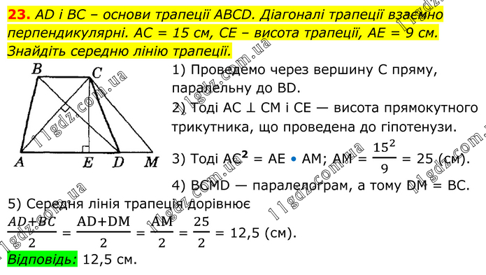 AD і BC – основи трапеції ABCD. Діагоналі трапеції взаємно перпендикулярні. AC = 15 см, CE – висота трапеції, AE = 9 см. Знайдіть середню лінію трапеції. 1) Проведемо через вершину C пряму, паралельну до BD. 2) Тоді AC ⊥ CM і CE — висота прямокутного трикутника, що проведена до гіпотенузи. 3) Тоді AC2 = AE • AM; AM = 15^2/9 = 25 (см). 4) BCMD — паралелограм, а тому DM = BC. 5) Середня лінія трапеція дорівнює (AD+BC)/2 = (AD+DM)/2 = AM/2 = 25/2 = 12,5 (см). Відповідь: 12,5 см.
