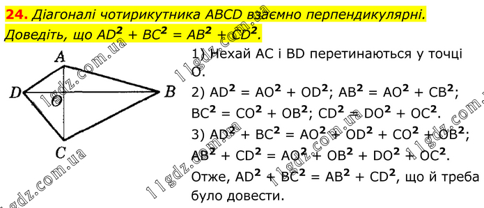 Діагоналі чотирикутника ABCD взаємно перпендикулярні. Доведіть, що AD2 + BC2 = AB2 + CD2. 1) Нехай AC і BD перетинаються у точці О. 2) AD2 = AO2 + OD2; AB2 = AO2 + CB2; BC2 = СО2 + OB2; CD2 = DO2 + OC2. 3) AD2 + BC2 = AO2 + OD2 + CO2 + OB2; AB2 + CD2 = AO2 + OB2 + DO2 + OC2. Отже, AD2 + BC2 = AB2 + CD2, що й треба було довести.