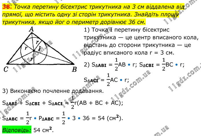 Точка перетину бісектрис трикутника на 3 см віддалена від прямої, що містить одну зі сторін трикутника. Знайдіть площу трикутника, якщо йог о периметр дорівнює 36 см. 1) Точка І перетину бісектрис трикутника — це центр вписаного кола, відстань до сторони трикутника — це радіус вписаного кола r = 3 см. 2) S∆ABI = 1/2AB • r; S∆CBI = 1/2BC • r; S∆ACI = 1/2AC • r; 3) Виконаємо почленне додавання. S∆ABI + S∆CBI + S∆ACI = 1/2r(AB + BC + AC); S∆ABC = 1/2r • P∆ABC = 1/2 • 3 • 36 = 54 (см2). Відповідь: 54 см2.