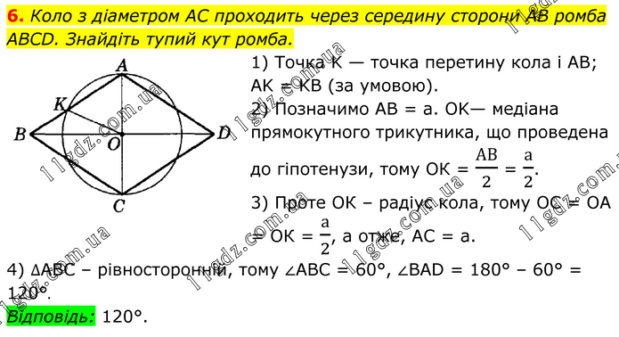 Коло з діаметром AC проходить через середину сторони AB ромба ABCD. Знайдіть тупий кут ромба. 1) Точка K — точка перетину кола і AB; AK = KB (за умовою). 2) Позначимо AB = a. OK— медіана прямокутного трикутника, що проведена до гіпотенузи, тому ОК = АВ/2 = а/2. 3) Проте ОК – радіус кола, тому ОС = ОА = ОК = а/2, а отже, АС = а. 4) ∆АВС – рівносторонній, тому ∠АВС = 60°, ∠BAD = 180° – 60° = 120°. Відповідь: 120°.
