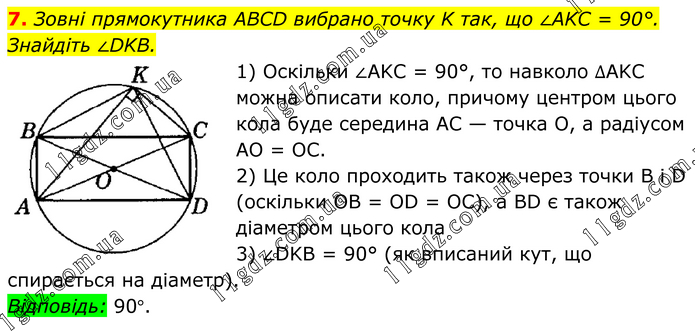 Зовні прямокутника ABCD вибрано точку K так, що ∠AKC = 90°. Знайдіть ∠DKB. 1) Оскільки ∠AKC = 90°, то навколо ∆AKC можна описати коло, причому центром цього кола буде середина AC — точка О, а радіусом AO = ОС. 2) Це коло проходить також через точки B i D (оскільки OB = OD = ОС), a BD є також діаметром цього кола 3) ∠DKB = 90° (як вписаний кут, що спирається на діаметр). Відповідь: 90°.
