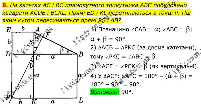 На катетах AC і BC прямокутного трикутника ABC побудовано квадрати ACDE і BCKL. Прямі ED і KL перетинаються в точці P. Під яким кутом перетинаються прямі PC і AB? 1) Позначимо ∠CAB = α; ∠ABC = β; α + β = 90°. 2) ∆ACB = ∆PKC (за двома катетами), тому ∠PKC = ∠ABC = β. 3) ∠ACF = ∠PCK = β (як вертикальні). 4) У ∆ACF: ∠AFC = 180° – (α + β) = 180° – 90° = 90°. Відповідь: 90°.