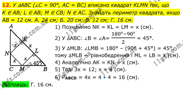 12. У ∆ABC (∠C = 90°, AC = BC) вписано квадрат KLMN так, що K ∈ AB; L ∈ AB; M ∈ CB; N ∈ AC. Знайдіть периметр квадрата, якщо AB = 12 см. А. 24 см; Б. 20 см; В. 12 см; Г. 16 см. 1) Позначимо NK = KL = LM = х (см). 2) У ∆АВС: ∠B = ∠A= (180°-90°)/2 = 45°. 3) У ∆MLB: ∠LMB = 180° – (90° + 45°) = 45°, тому ∆MLB — рівнобедрений і ML = LB = х (см). 4) Аналогічно AK = KN = х (см). 5) Тоді Зх = 12; х = 4 (см). 6) PABCD = 4х = 4 • 4 = 16 (см). Відповідь: Г. 16 см.