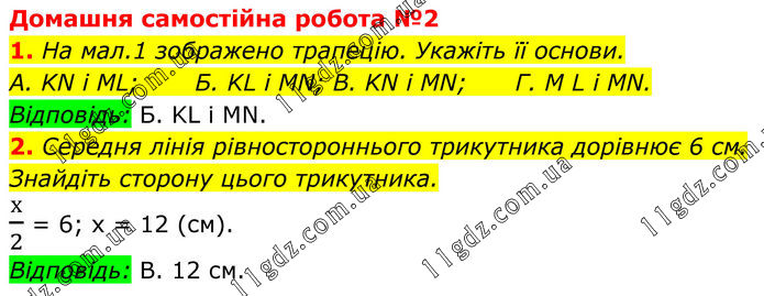 Домашня самостійна робота №2 1. На мал.1 зображено трапецію. Укажіть її основи. A. KN і ML; Б. KL і MN; B. KN і MN; Г. M L і MN. Відповідь: Б. KL і MN. 2. Середня лінія рівностороннього трикутника дорівнює 6 см. Знайдіть сторону цього трикутника. х/2 = 6; х = 12 (см). Відповідь: В. 12 см.