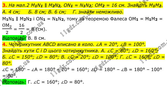 3. На мал.2 M1N1 ∥ M2N2, ON1 = N1N2; OM2 = 16 см. Знайдіть M1M2. A. 4 см; Б. 8 см; В. 6 см; Г. знайти неможливо. M1N1 ∥ M2N2 і ON1 = N1N2, тому за теоремою Фалеса OM1 = M1M2 = (ОМ_2)/2 = 16/2 = 8 (см). Відповідь: В. 8 см. 4. Чотирикутник ABCD вписано в коло. ∠A = 20°, ∠B = 100°. Знайдіть кути C і D цього чотирикутника. А. ∠C = 80°; ∠D = 160°; Б. ∠C = 150°; ∠D = 80°; В. ∠C = 20°; ∠D = 100°; Г. ∠C = 160°; ∠D = 80°. ∠C = 180° – ∠A = 180° – 20° = 160°; ∠D = 180° – ∠B = 180° – 100° = 80°. Відповідь: Г. ∠C = 160°; ∠D = 80°.