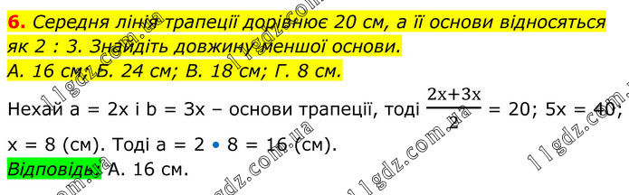 6. Середня лінія трапеції дорівнює 20 см, а її основи відносяться як 2 : 3. Знайдіть довжину меншої основи. A. 16 см; Б. 24 см; В. 18 см; Г. 8 см. Нехай а = 2х і b = Зх – основи трапеції, тоді (2х+3х)/2 = 20; 5х = 40; х = 8 (см). Тоді а = 2 • 8 = 16 (см). Відповідь: А. 16 см.