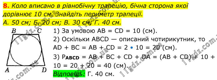 8. Коло вписано в рівнобічну трапецію, бічна сторона якої дорівнює 10 см. Знайдіть периметр трапеції. А. 50 см; Б. 20 см; В. 30 см; Г. 40 см. 1) За умовою AB = CD = 10 (см). 2) Оскільки ABCD — описаний чотирикутник, то AD + BC = AB + CD = 2 • 10 = 20 (см). 3) PABCD = AB + BC + CD + DA = (AB + CD) + 10 + 10 = 20 + 20 = 40 (см). Відповідь: Г. 40 см.