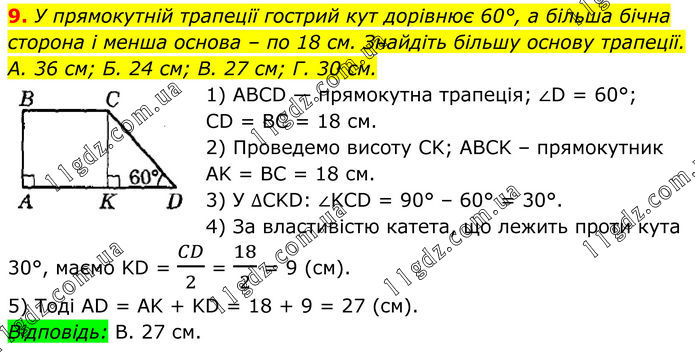 9. У прямокутній трапеції гострий кут дорівнює 60°, а більша бічна сторона і менша основа – по 18 см. Знайдіть більшу основу трапеції. А. 36 см; Б. 24 см; В. 27 см; Г. 30 см. 1) ABCD — прямокутна трапеція; ∠D = 60°; CD = BC = 18 см. 2) Проведемо висоту CK; ABCK – прямокутник AK = BC = 18 см. 3) У ∆CKD: ∠KCD = 90° – 60° = 30°. 4) За властивістю катета, що лежить проти кута 30°, маємо KD = CD/2 = 18/2 = 9 (см). 5) Тоді AD = AK + KD = 18 + 9 = 27 (см). Відповідь: В. 27 см.