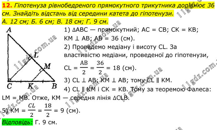 12. Гіпотенуза рівнобедреного прямокутного трикутника дорівнює 36 см. Знайдіть відстань від середини катета до гіпотенузи. А. 12 см; Б. 6 см; В. 18 см; Г. 9 см. 1) ∆ABC — прямокутний; AC = CB; CK = KB; KM ⊥ AB; AB = 36 (см). 2) Проведемо медіану і висоту CL. За властивістю медіани, проведеної до гіпотенузи, СL = АВ/2 = 36/2 = 18 (см). 3) CL ⊥ AB; KM ⊥ AB; тому CL ∥ KM. 4) CL ∥ KM і CK = KB. Тому за теоремою Фалеса: LM = MB. Отже, KM — середня лінія ∆CLB. 5) KM = CL/2 = 18/2 = 9 (см). Відповідь: Г. 9 см.
