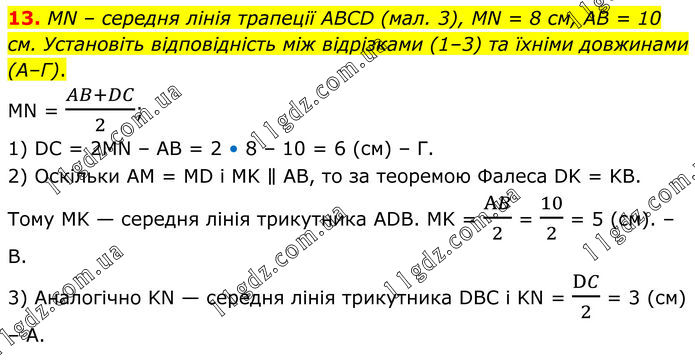 13. MN – середня лінія трапеції ABCD (мал. 3), MN = 8 см, AB = 10 см. Установіть відповідність між відрізками (1–3) та їхніми довжинами (А–Г). MN = (AB+DC)/2; 1) DC = 2MN – AB = 2 • 8 – 10 = 6 (см) – Г. 2) Оскільки AM = MD і MK ∥ AB, то за теоремою Фалеса DK = KB. Тому MK — середня лінія трикутника ADB. MK = AB/2 = 10/2 = 5 (см). – B. 3) Аналогічно KN — середня лінія трикутника DBC i KN = DC/2 = 3 (см) – A.