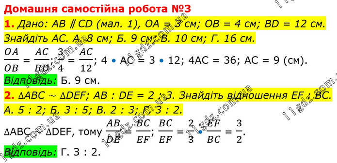 Домашня самостійна робота №3 1. Дано: AB ∥ CD (мал. 1), OA = 3 см; OB = 4 см; BD = 12 см. Знайдіть AC. A. 8 см; Б. 9 см; B. 10 см; Г. 16 см. OA/OB = AC/BD; 3/4 = AC/12; 4 • AC = 3 • 12; 4AC = 36; AC = 9 (cм). Відповідь: Б. 9 см. 2. ∆ABC ~ ∆DEF; AB : DE = 2 : 3. Знайдіть відношення EF : BC. A. 5 : 2; Б. 3 : 5; B. 2 : 3; Г. 3 : 2. ∆ABC ~ ∆DEF, тому AB/DE = BC/EF; BC/EF = 2/3 • EF/BC = 3/2. Відповідь: Г. З : 2.
