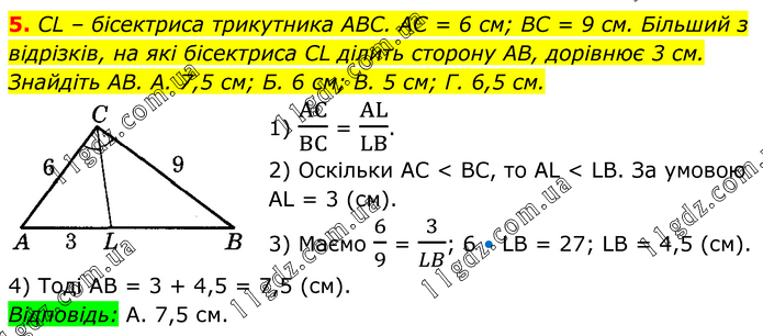 5. CL – бісектриса трикутника ABC. AC = 6 см; BC = 9 см. Більший з відрізків, на які бісектриса CL ділить сторону AB, дорівнює 3 см. Знайдіть AB. А. 7,5 см; Б. 6 см; В. 5 см; Г. 6,5 см. 1) AC/BC = AL/LB. 2) Оскільки AC < BC, то AL < LB. За умовою AL = 3 (см). 3) Маємо 6/9 = 3/LB; 6 • LB = 27; LB = 4,5 (см). 4) Тоді AB = 3 + 4,5 = 7,5 (см). Відповідь: А. 7,5 см.