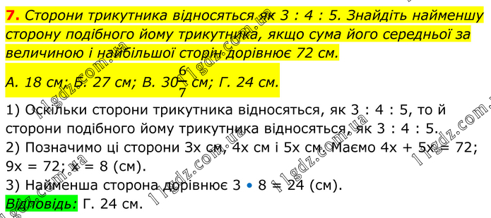 7. Сторони трикутника відносяться як 3 : 4 : 5. Знайдіть найменшу сторону подібного йому трикутника, якщо сума його середньої за величиною і найбільшої сторін дорівнює 72 см. А. 18 см; Б. 27 см; В. 306/7 см; Г. 24 см. 1) Оскільки сторони трикутника відносяться, як 3 : 4 : 5, то й сторони подібного йому трикутника відносяться, як 3 : 4 : 5. 2) Позначимо ці сторони Зх см, 4х см і 5х см. Маємо 4х + 5х = 72; 9х = 72; х = 8 (см). 3) Найменша сторона дорівнює 3 • 8 = 24 (см). Відповідь: Г. 24 см.