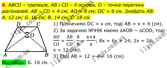 8. ABCD – трапеція, AB і CD – її основи, O – точка перетину діагоналей. AB – CD = 4 см; AO = 8 см; OC = 6 см. Знайдіть AB. А. 12 см; Б. 16 см; В. 14 см; Г. 18 см. 1) Позначимо DC = х см, тоді AB = х + 4 (см). 2) За задачею №496 маємо ∆AOB ~ ∆COD, тоді АО/СО = АВ/CD; 8/6 = (x+4)/x; 8x = 6x + 24; 2x = 24; x = 12 (см). 3) Тоді АВ = 12 + 4 = 16 (см). Відповідь: Б. 16 см.
