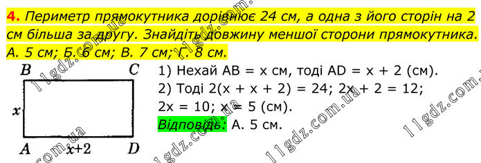 4. Периметр прямокутника дорівнює 24 см, а одна з його сторін на 2 см більша за другу. Знайдіть довжину меншої сторони прямокутника. A. 5 см; Б. 6 см; В. 7 см; Г. 8 см. 1) Нехай AB = х см, тоді AD = х + 2 (см). 2) Тоді 2(х + х + 2) = 24; 2х + 2 = 12; 2х = 10; х = 5 (см). Відповідь: А. 5 см.
