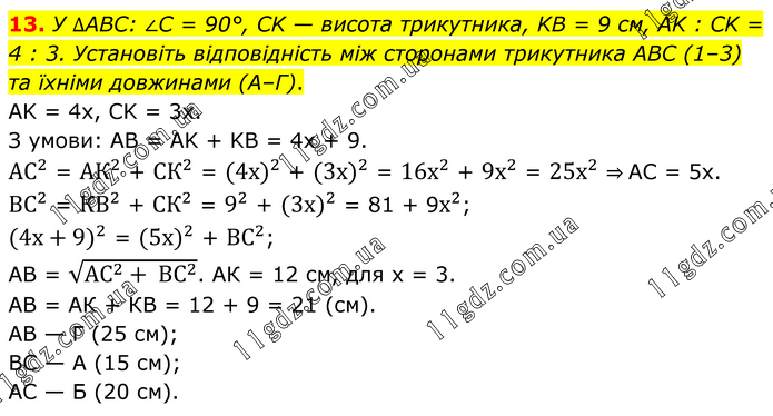 У ∆ABC: ∠C = 90°, CK — висота трикутника, KB = 9 см, AK : CK = 4 : 3. Установіть відповідність між сторонами трикутника ABC (1–3) та їхніми довжинами (А–Г). AK = 4x, CK = 3x. З умови: AB = AK + KB = 4x + 9. 〖АС〗^2 = 〖АК〗^2 + 〖СК〗^2 = 〖(4х)〗^2 + 〖(3х)〗^2 = 〖16х〗^2 + 〖9х〗^2 = 〖25х〗^2 ⇒ AC = 5x. 〖ВС〗^2 = 〖КВ〗^2 + 〖СК〗^2 = 9^2 + 〖(3х)〗^2 = 81 + 9х^2; 〖(4х+9)〗^2 = 〖(5х)〗^2 + 〖ВС〗^2; АВ = √(〖АС〗^2+ 〖ВС〗^2 ). АК = 12 см, для х = 3. АВ = АК + КВ = 12 + 9 = 21 (см). AB — Г (25 см); BC — А (15 см); AC — Б (20 см).