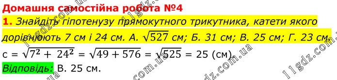 Домашня самостійна робота №4 1. Знайдіть гіпотенузу прямокутного трикутника, катети якого дорівнюють 7 см і 24 см. А. √527 см; Б. 31 см; В. 25 см; Г. 23 см. с = √(7^2+ 24^2 ) = √(49+576) = √525 = 25 (см). Відповідь: В. 25 см.