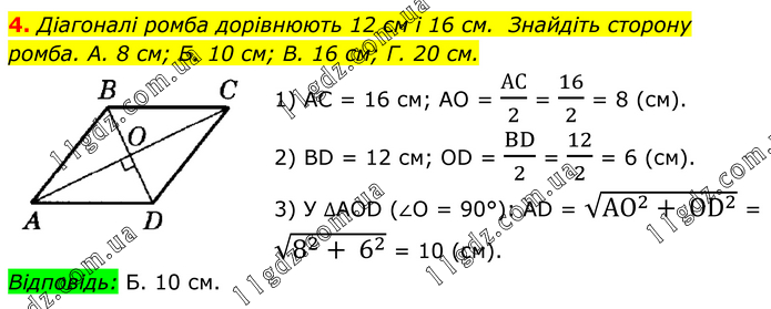 Діагоналі ромба дорівнюють 12 см і 16 см. Знайдіть сторону ромба. A. 8 см; Б. 10 см; B. 16 см; Г. 20 см. 1) АС = 16 см; АО = АС/2 = 16/2 = 8 (см). 2) BD = 12 см; OD = BD/2 = 12/2 = 6 (см). 3) У ∆AOD (∠O = 90°): AD = √(AO^2+ OD^2 ) = √(8^2+ 6^2 ) = 10 (см). Відповідь: Б. 10 см.