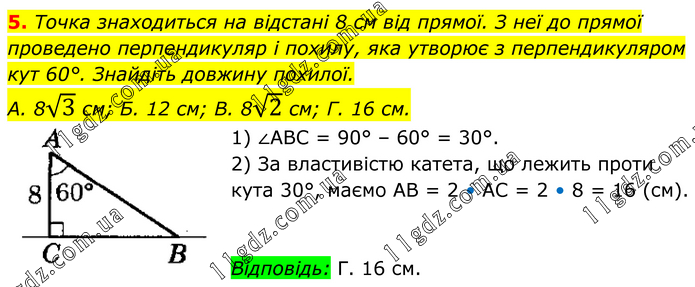 Точка знаходиться на відстані 8 см від прямої. З неї до прямої проведено перпендикуляр і похилу, яка утворює з перпендикуляром кут 60°. Знайдіть довжину похилої. А. 8√3 см; Б. 12 см; В. 8√2 см; Г. 16 см. 1) ∠ABC = 90° – 60° = 30°. 2) За властивістю катета, що лежить проти кута 30°, маємо AB = 2 • AC = 2 • 8 = 16 (см). Відповідь: Г. 16 см.
