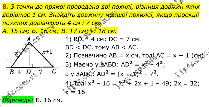 З точки до прямої проведено дві похилі, різниця довжин яких дорівнює 1 см. Знайдіть довжину меншої похилої, якщо проекції похилих дорівнюють 4 см і 7 см. А. 15 см; Б. 16 см; В. 17 см; Г. 18 см. 1) BD = 4 см; DC = 7 см. BD < DC, тому AB < AC. 2) Позначимо AB = х см, тоді AC = х + 1 (см). 3) Маємо у ∆ABD: AD2 = х2 – 42; а у ∆АDС: AD2 = (х + 1)2 – 72. 4) Тоді x2 – 16 = x2 + 2х + 1 – 49; 2х = 32; х = 16. Відповідь: Б. 16 см.