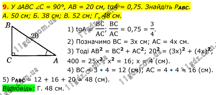 У ∆ABC ∠C = 90°, AB = 20 см, tgA = 0,75. Знайдіть PАВС. А. 50 см; Б. 38 см; В. 52 см; Г. 48 см. 1) tgA = BC/AC; BC/AC = 0,75 = 3/4. 2) Позначимо BC = Зх см; AC = 4х см. 3) Тоді AB2 = BC2 + AC2; 202 = (Зх)2 + (4х)2; 400 = 25x2; x2 = 16; х = 4 (см). 4) BC = 3 • 4 = 12 (см); AC = 4 • 4 = 16 (см). 5) PABC = 12 + 16 + 20 = 48 (см). Відповідь: Г. 48 см.