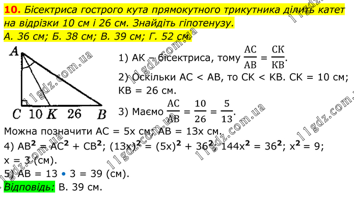 Бісектриса гострого кута прямокутного трикутника ділить катет на відрізки 10 см і 26 см. Знайдіть гіпотенузу. А. 36 см; Б. 38 см; В. 39 см; Г. 52 см. 1) АК – бісектриса, тому АС/АВ = СК/КВ. 2) Оскільки АС < AB, то CK < KB. CK = 10 см; КВ = 26 см. 3) Маємо АС/АВ = 10/26 = 5/13. Можна позначити AC = 5х см; AB = 1Зх см. 4) AB2 = AC2 + CB2; (1Зх)2 = (5х)2 + 362; 144x2 = 362; х2 = 9; х = 3 (см). 5) AB = 13 • 3 = 39 (см). Відповідь: В. 39 см.