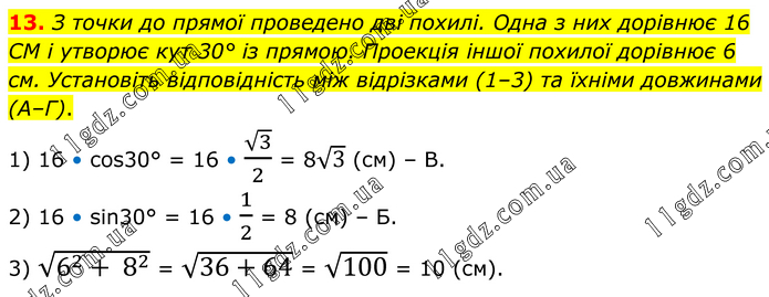 З точки до прямої проведено дві похилі. Одна з них дорівнює 16 CM і утворює кут 30° із прямою. Проекція іншої похилої дорівнює 6 см. Установіть відповідність між відрізками (1–3) та їхніми довжинами (А–Г). 1) 16 • cos30° = 16 • √3/2 = 8√3 (см) – В. 2) 16 • sin30° = 16 • 1/2 = 8 (см) – Б. 3) √(6^2+ 8^2 ) = √(36+64) = √100 = 10 (см).
