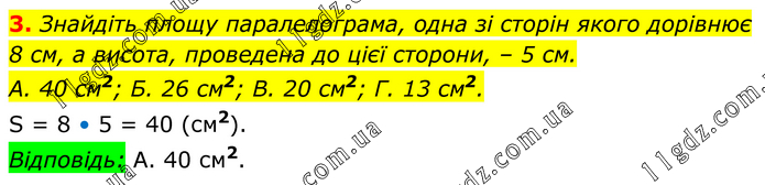 3. Знайдіть площу паралелограма, одна зі сторін якого дорівнює 8 см, а висота, проведена до цієї сторони, – 5 см. А. 40 см2; Б. 26 см2; В. 20 см2; Г. 13 см2. S = 8 • 5 = 40 (см2). Відповідь: А. 40 см2.